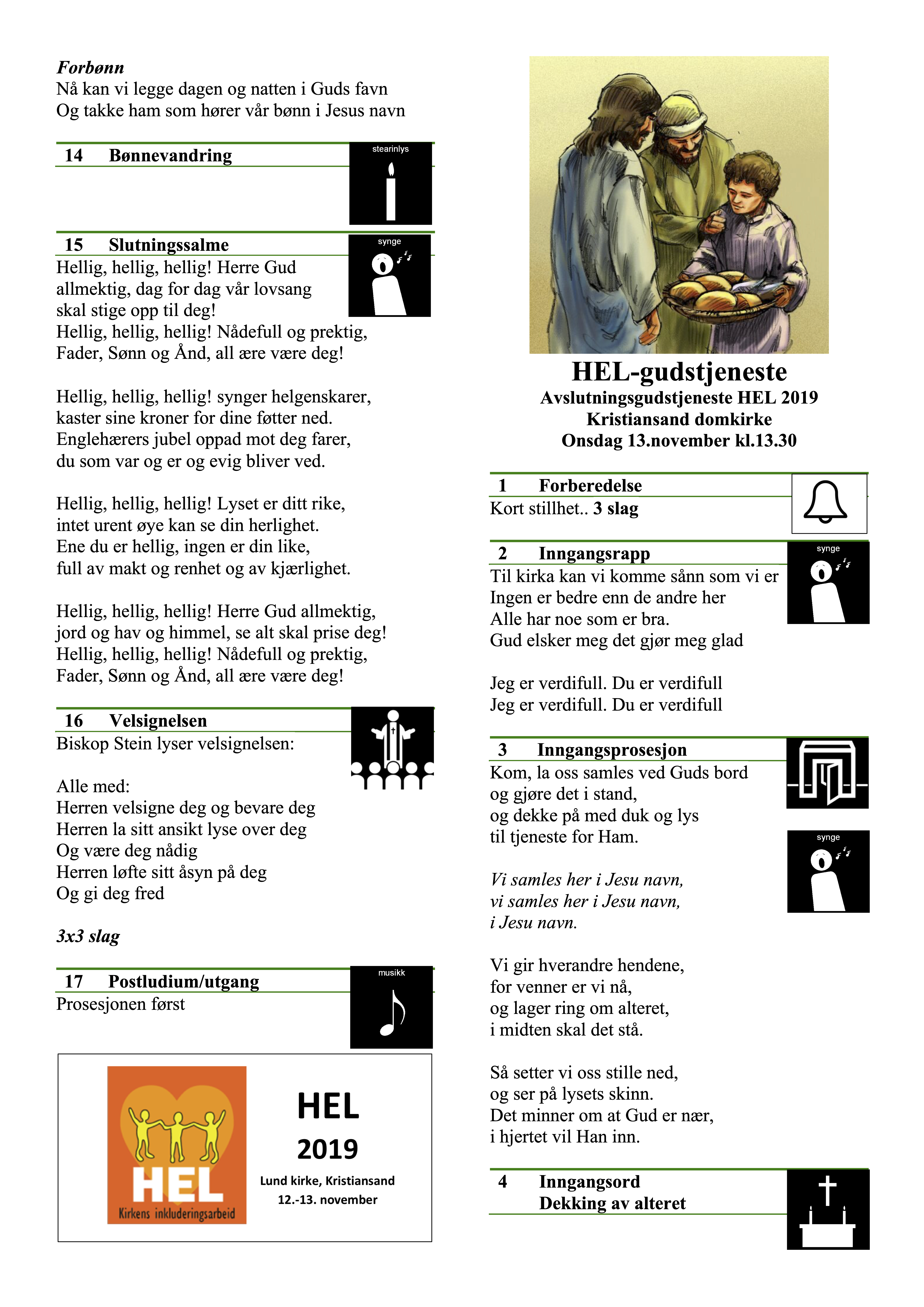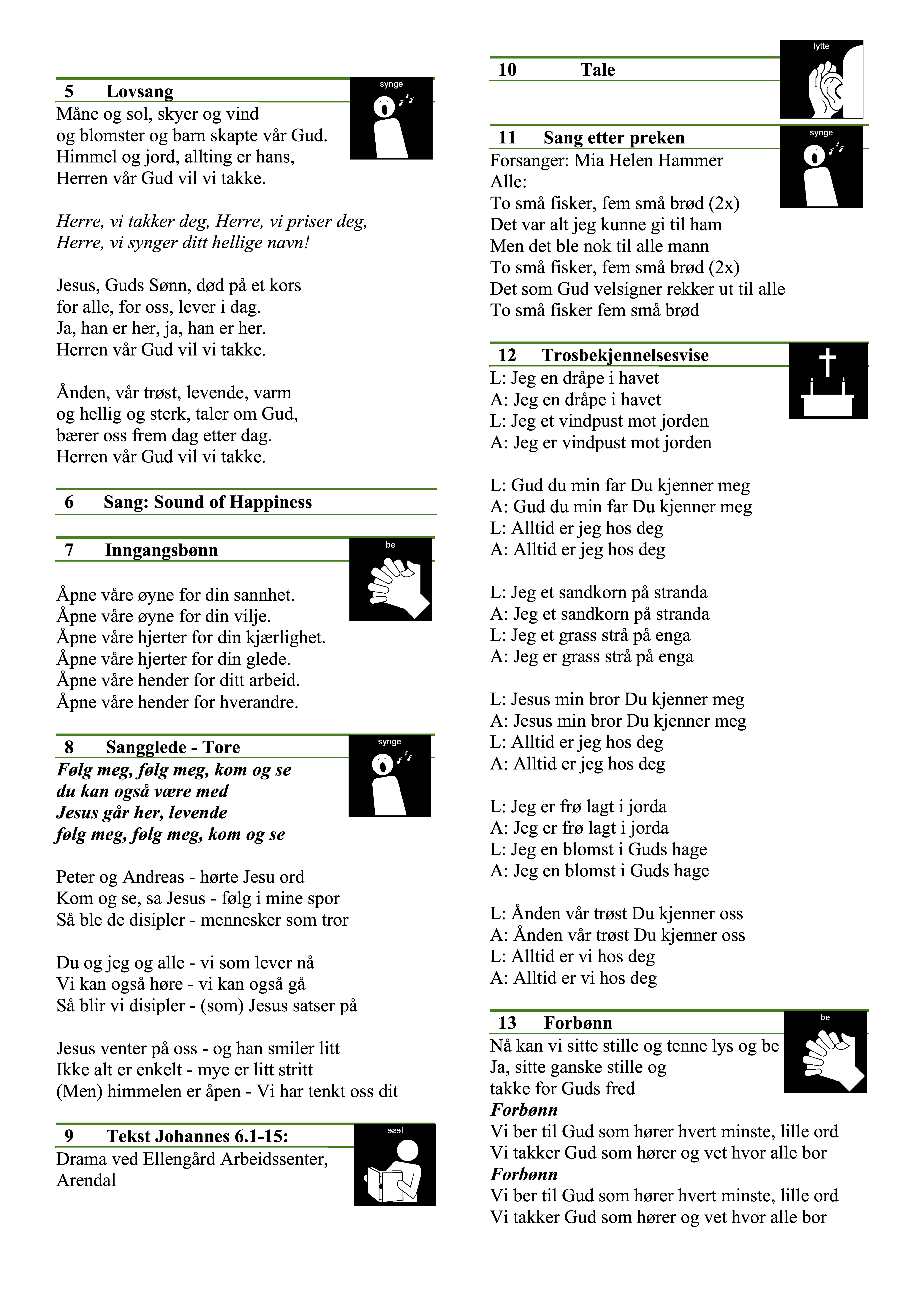 Her finner du et eksempel på hvordan du kan legge piktogrammer på et gudstjenesteprogram. Å bruke piktogrammer understøtter læring og tilfredshet for mange i en gudstjeneste. Om programmet trykkes eller det vises på veggen vil det være til nytte.