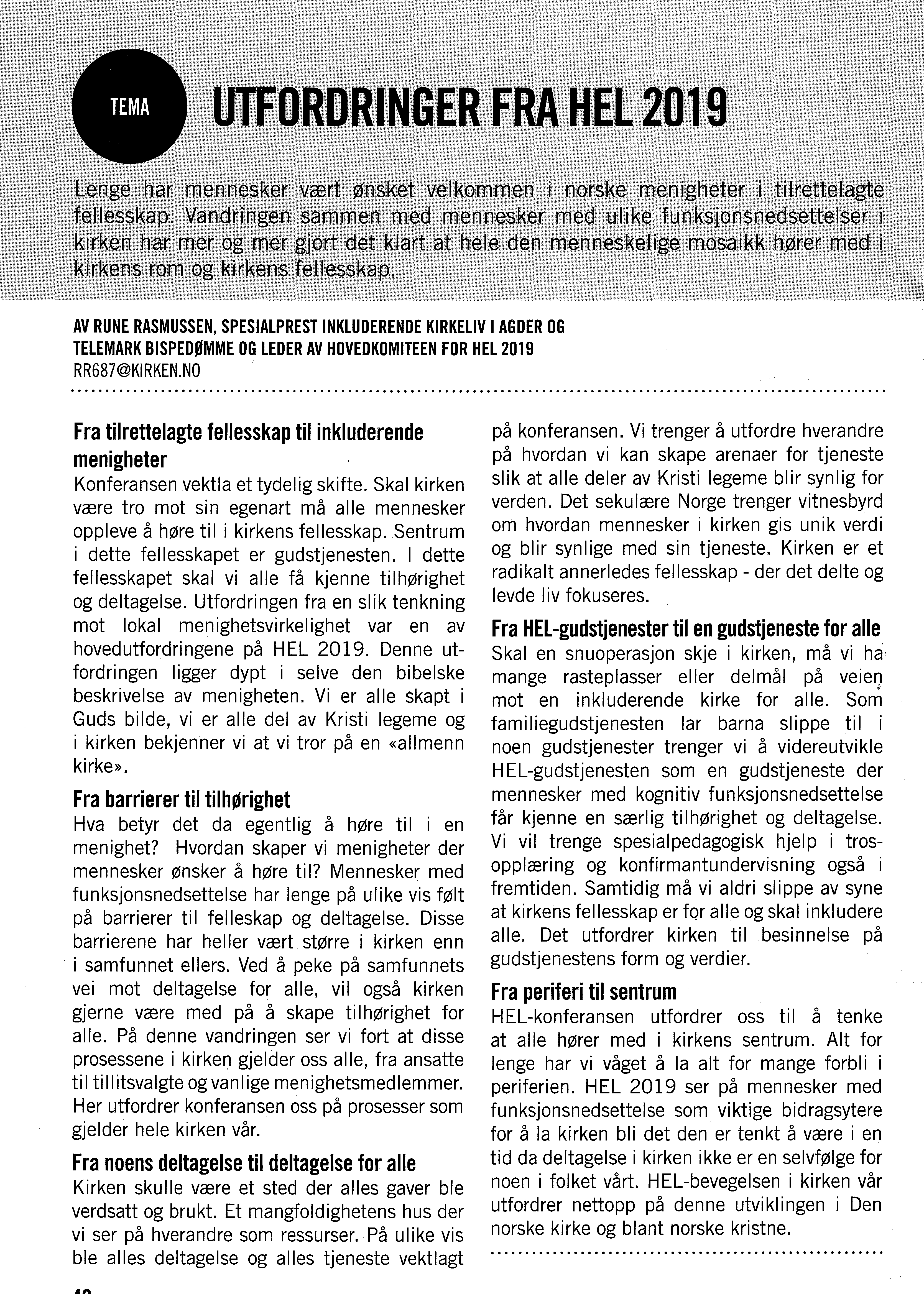 I denne artikkelen som stod på trykk i Lutherske kirketidende 2.2020 forsøker jeg å vise hvordan HEL 2019 utfordrer menigheter til å tenke inkludering som en naturlig del av det å være kirke. Kommenter gjerne under artikkelen.